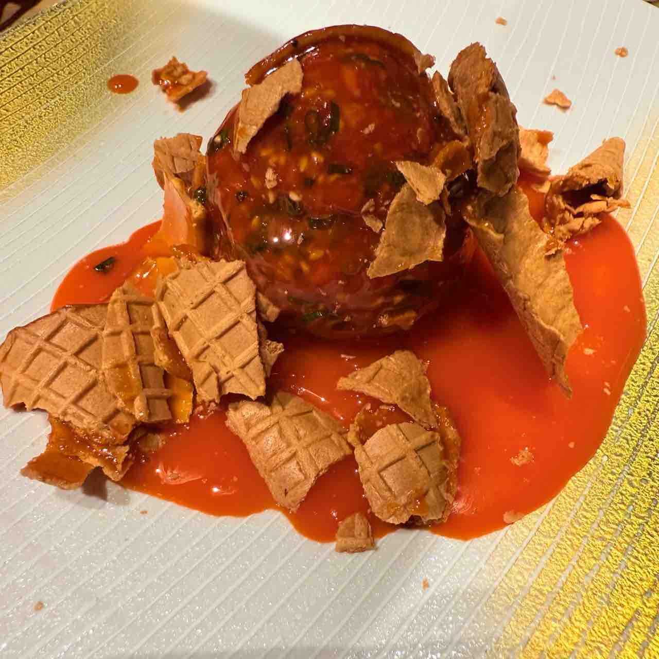 コーンの上に、ユッケが載っています。