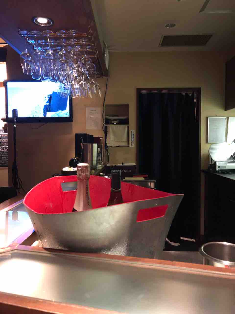 こちら「さん」では、ワイングラスに日本酒を半合入れるスタイルをとっています。